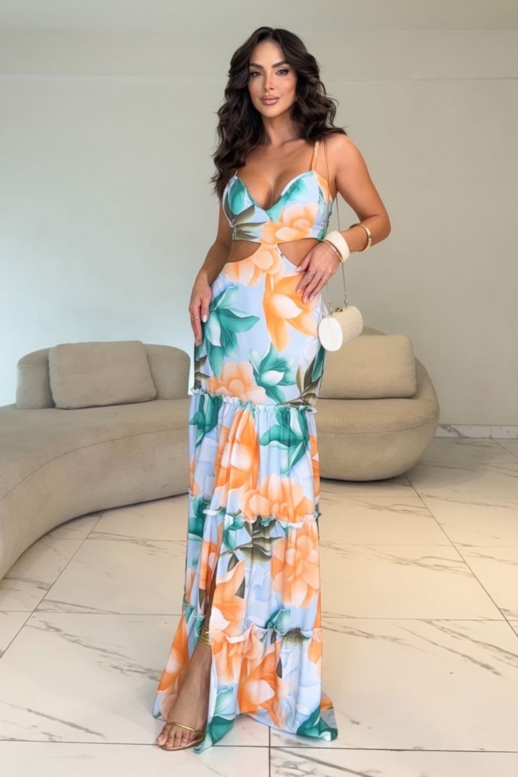 Vestido longo em Silk Flow com bojo, forro e alças finas reguláveis, garantindo conforto e caimento impecável. A fenda frontal adiciona charme e movimento ao visual. Tamanho único veste 38 ao 42. Disponível em Verde Claro, Azul Claro e Rosinha Claro, perfeito para eventos, dias quentes e ocasiões especiais.